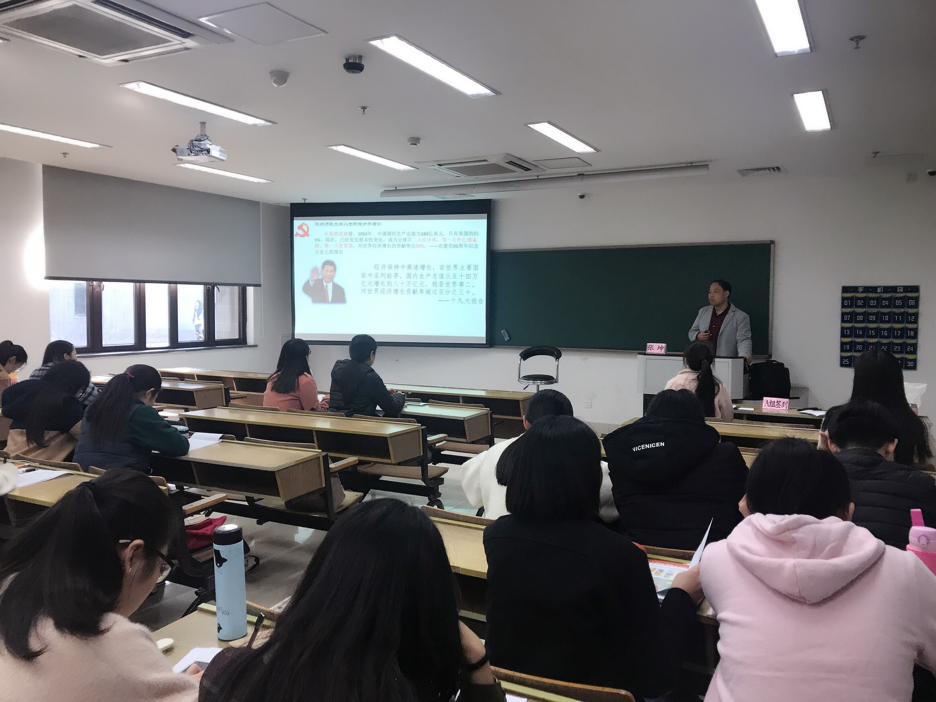 张坤老师阐述了中国共产党的光辉历史、中国共产党的光荣传统、继承和发扬党的光荣传统三方面内容。首先,张老师叙述了党史的三大阶段,并且对党的三个伟大历史贡献进行了全面分析。其次,张老师从历史、理论和现实三个维度为学员们讲解了党的传统,让学员们对党的传统有了更深入地了解。同时张老师结合了大量英雄事迹与“党的十九大”精神,让学员们更加坚定了加入党组织和发扬党的光荣传统的信念与决心。最后,张老师激励学员们,继承和发扬党的传统有以下几点要求:一是入党要懂党,认真学习党的光辉历史,做政治上的明白人;二是入党要爱党,认真遵守党的各项纪律,做规矩上的老实人;三是入党要言党,自觉加强党性修养,做群众面前的代言人;四是入党要兴党,努力全面提升自我,做事业上的接班人。