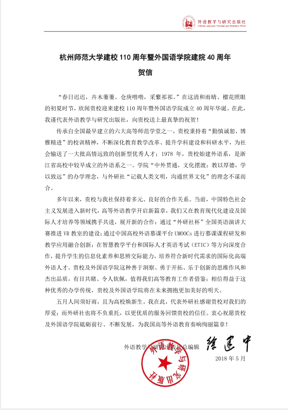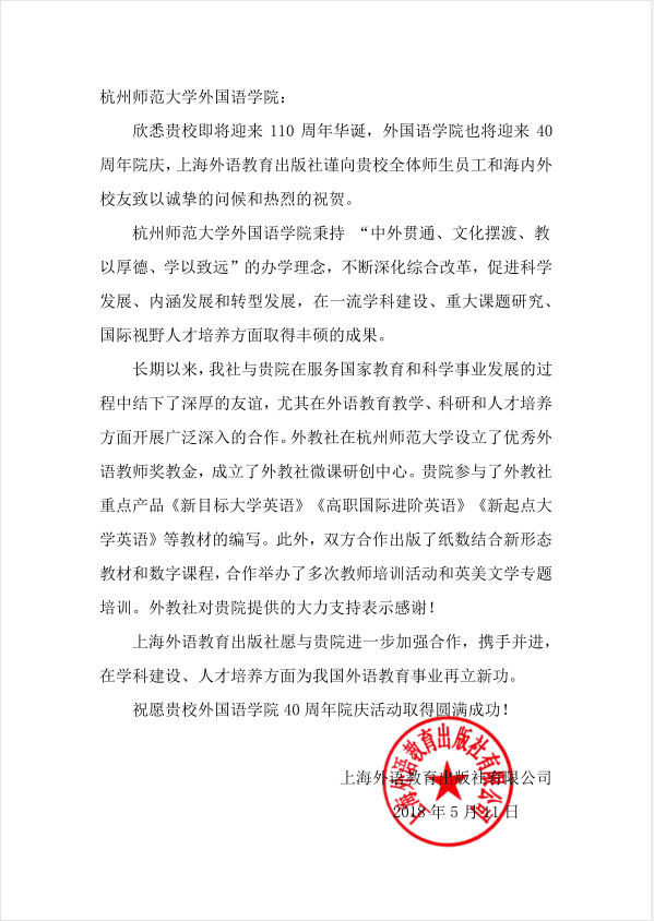 洋洋学海,荟萃一堂,巍巍学府,桃李芳芬。在黄色网址 喜迎40周年华诞之际,各兄弟高校、友好合作单位以及国际合作伙伴纷纷发来贺信,向学院全体师生和广大校友致以热烈的祝贺。学院共收到21封贺信,分别来自:英国剑桥大学东方教育与发展协会、外语教学与研究出版社、上海外语教育出版社、澳大利亚昆士兰大学、美国新奥尔良大学、日本女子活水大学、西班牙阿利坎特大学、韩国沃川文学院、北京大学、清华大学、浙江大学、上海交通大学、南京大学、中山大学、厦门大学、湖南师范大学、北京外国语大学、上海外国语大学、北京语言大学、河南师范大学和四川外国语大学。