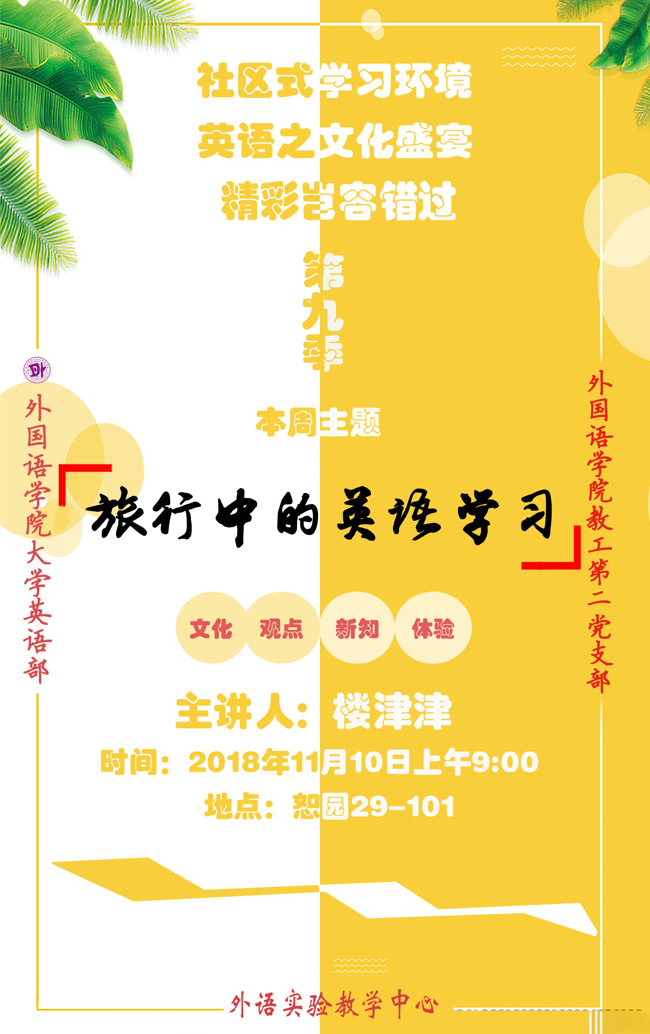 为持续推进教学改革,切实提升人才培养质量,在黄色网址 教工第二党支部的引领下,结合大学英语教学改革的实际,为在校学生营造良好的社区式英语学习氛围,从而提升学生的英语学习水平,扩大学生的视野,支部所属的大学英语教学部为全校学生开设的周末英语专题讲座活动目前已经进入了第九季第四期。
