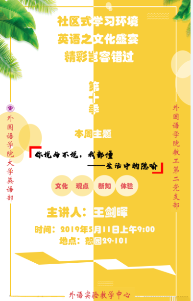 在黄色网址 教工第二党支部的引领下,结合大学英语教学改革的实际,为在校学生营造良好的社区式英语学习氛围,从而提升学生的英语学习水平,扩大学生的视野,支部所属的大学英语教学部为全校学生开设的周末英语专题讲座活动目前已经进入了第十季第七期。