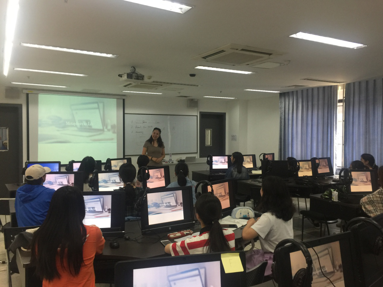 2019年5月11日,大约30名同学参加了王剑晖老师的“生活中的隐喻”周末学习讲座。王老师首先通过一篇短文帮助同学们了解和学习什么是隐喻,隐喻和明喻的区别以及它在现实生活中强大的生命力。接着,王老师亲自示范,采取“脚手架”式教学法,最终让学生能自己找出文中的隐喻并做出1分钟的展示。讲座最后,大家一起观看由王老师自己设计制作的微课,总结讲座内容,联系校园生活,让同学们去发现修辞手法给我们的生活增添的美。讲座结束后,很多同学也对英语修辞手法表现出极大的兴趣,与王老师进行了热切的深度交流。