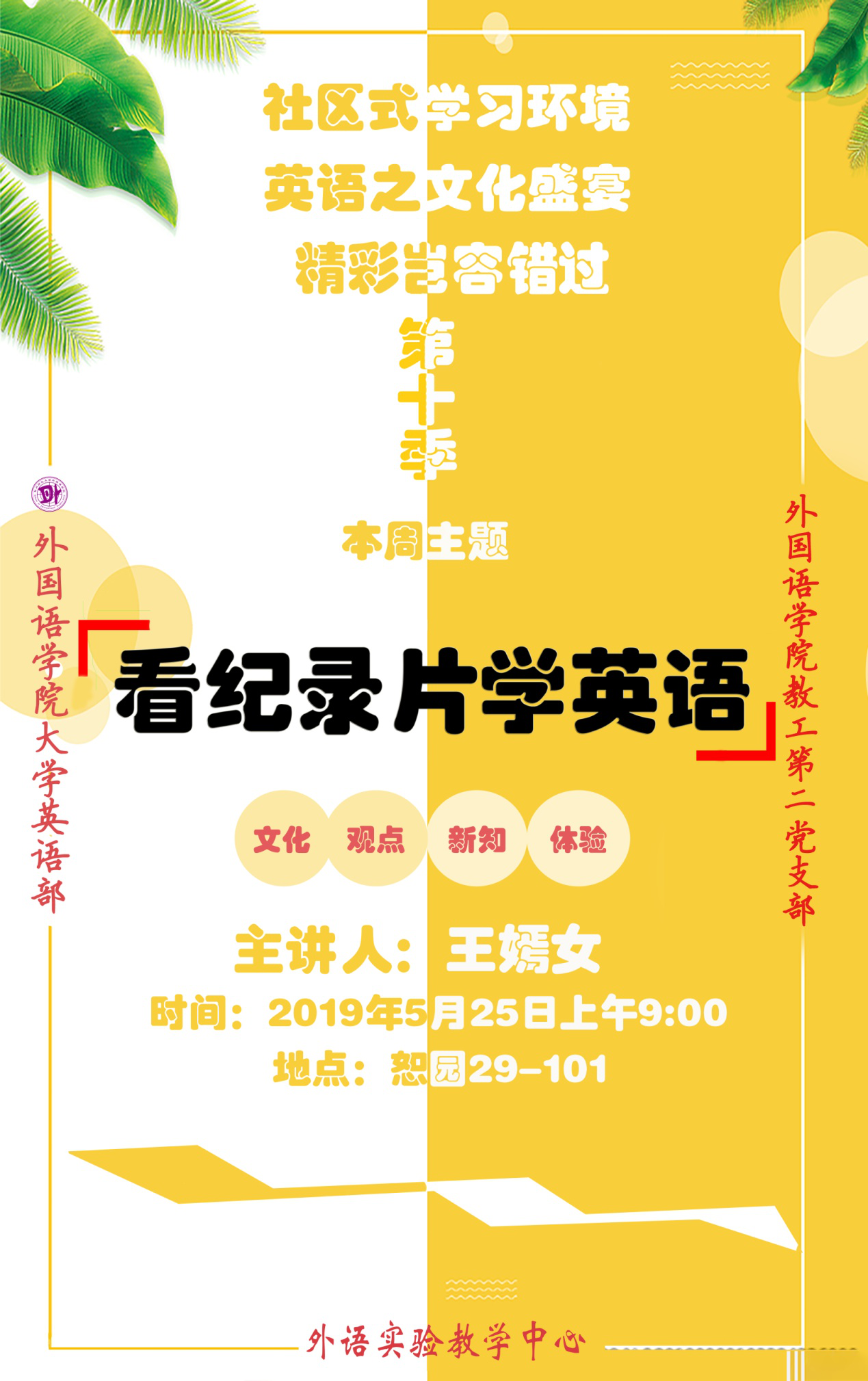 在黄色网址 教工第二党支部的引领下,结合大学英语教学改革的实际,为在校学生营造良好的社区式英语学习氛围,从而提升学生的英语学习水平,扩大学生的视野,支部所属的大学英语教学部为全校学生开设的周末英语专题讲座活动目前已经进入了第十季第九期。