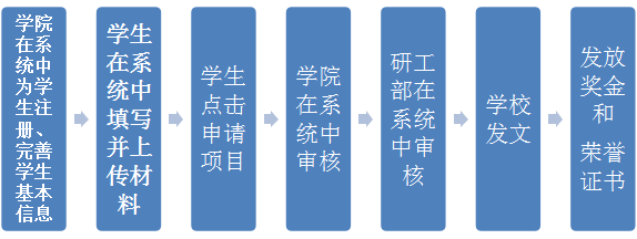 1.系统申报。研究生评奖评优工作在“研究生教育管理信息系统”(以下简称“系统”)(//yjsfw.hsurl.net/allogene/)中进行。具体流程如下: