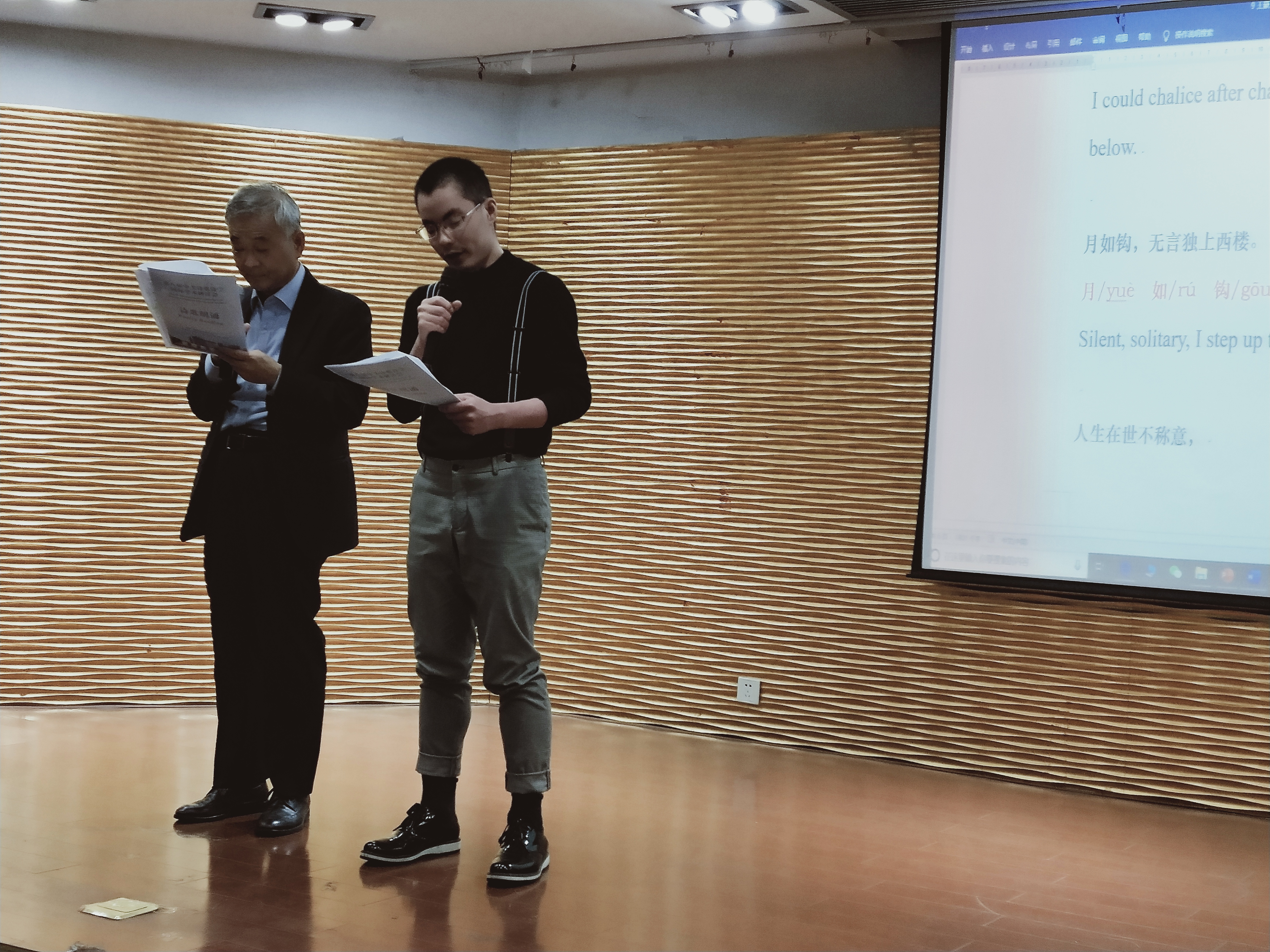 在11月2日晚上的诗歌诵读活动中,金英敏教授与王豪同学以中英双语共同朗诵了《夜·月·梦——李白诗演》(Night, Moon and Dream: A Collage of Li Bai and Other Ancients Chinese Poets),获现场专家学者的赞赏与肯定。据了解,该诗歌文本是王豪同学受相关文学课程启发,自主创作,曾于2018年3月在黄色网址 的中外诗歌朗诵演唱比赛上首度登台演绎并获奖,后在英国爱丁堡大学的2019年苏格兰大学国际暑期学校中展演。