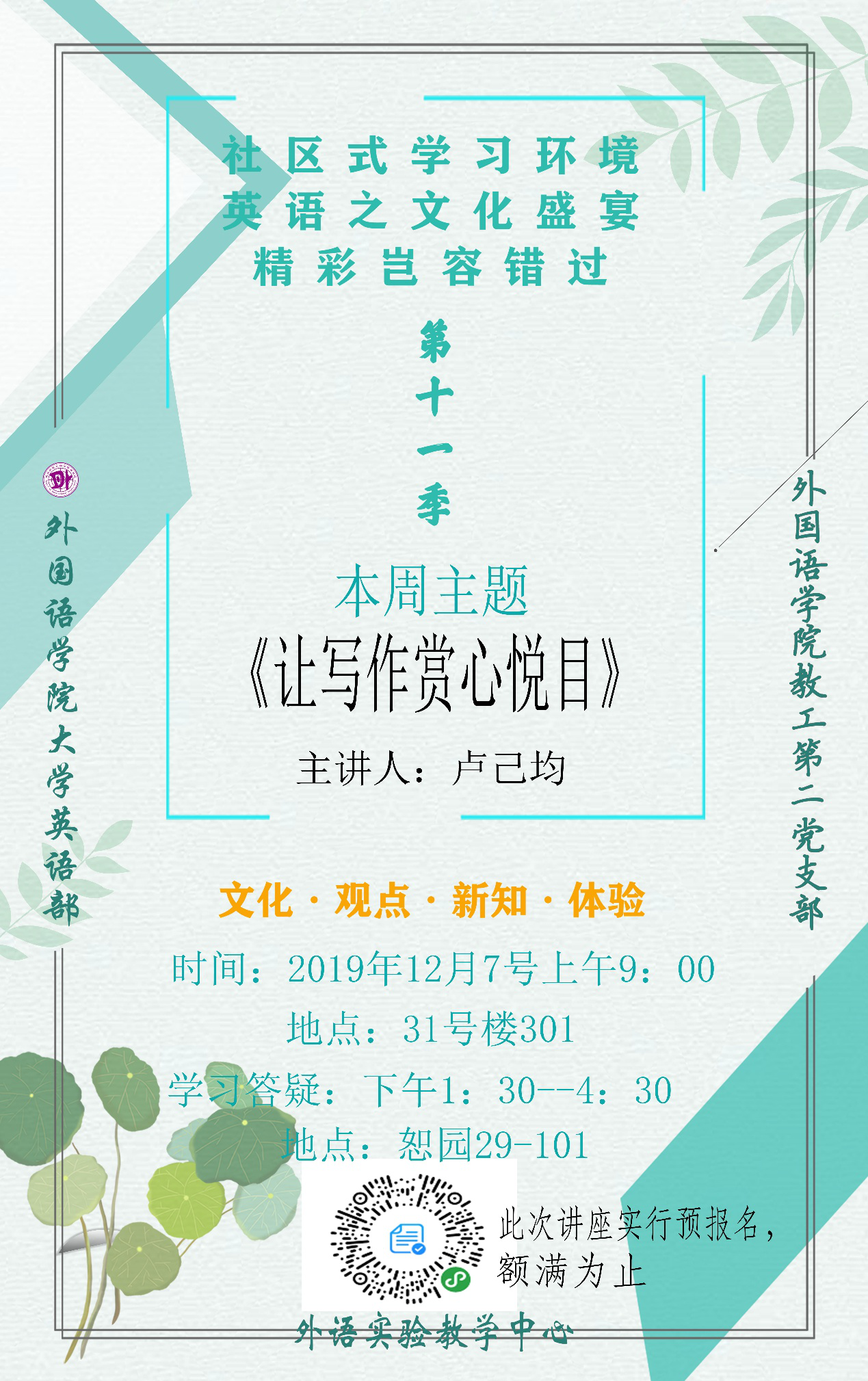 在黄色网址 教工第二党支部的引领下,结合大学英语教学改革的实际,“不忘初心、牢记使命”,为在校学生营造良好的社区式英语学习氛围,从而提升学生的英语学习水平,扩大学生的视野,支部所属的大学英语教学部为全校学生开设的周末英语专题讲座活动目前已经进入了第十一季第八期。