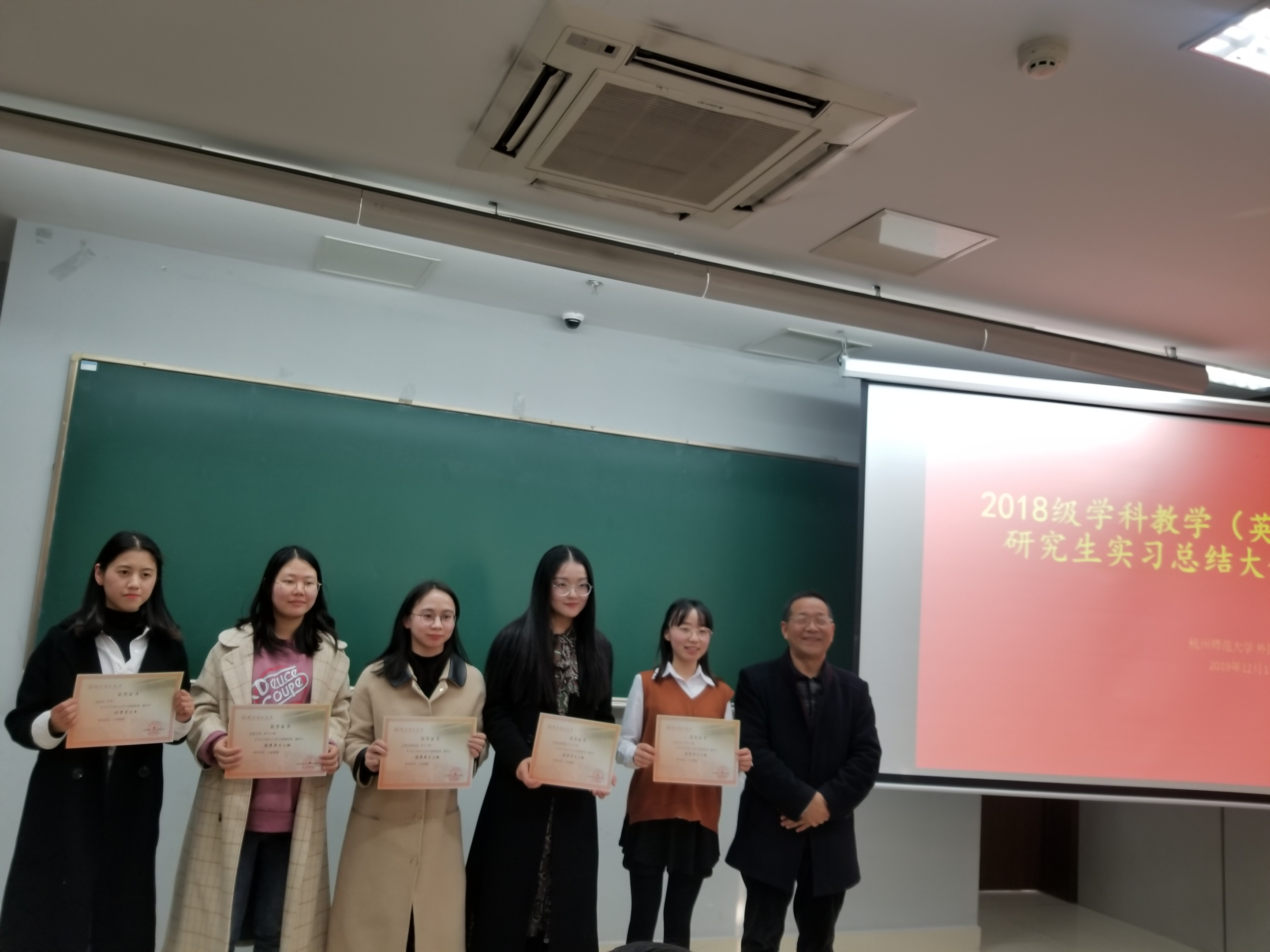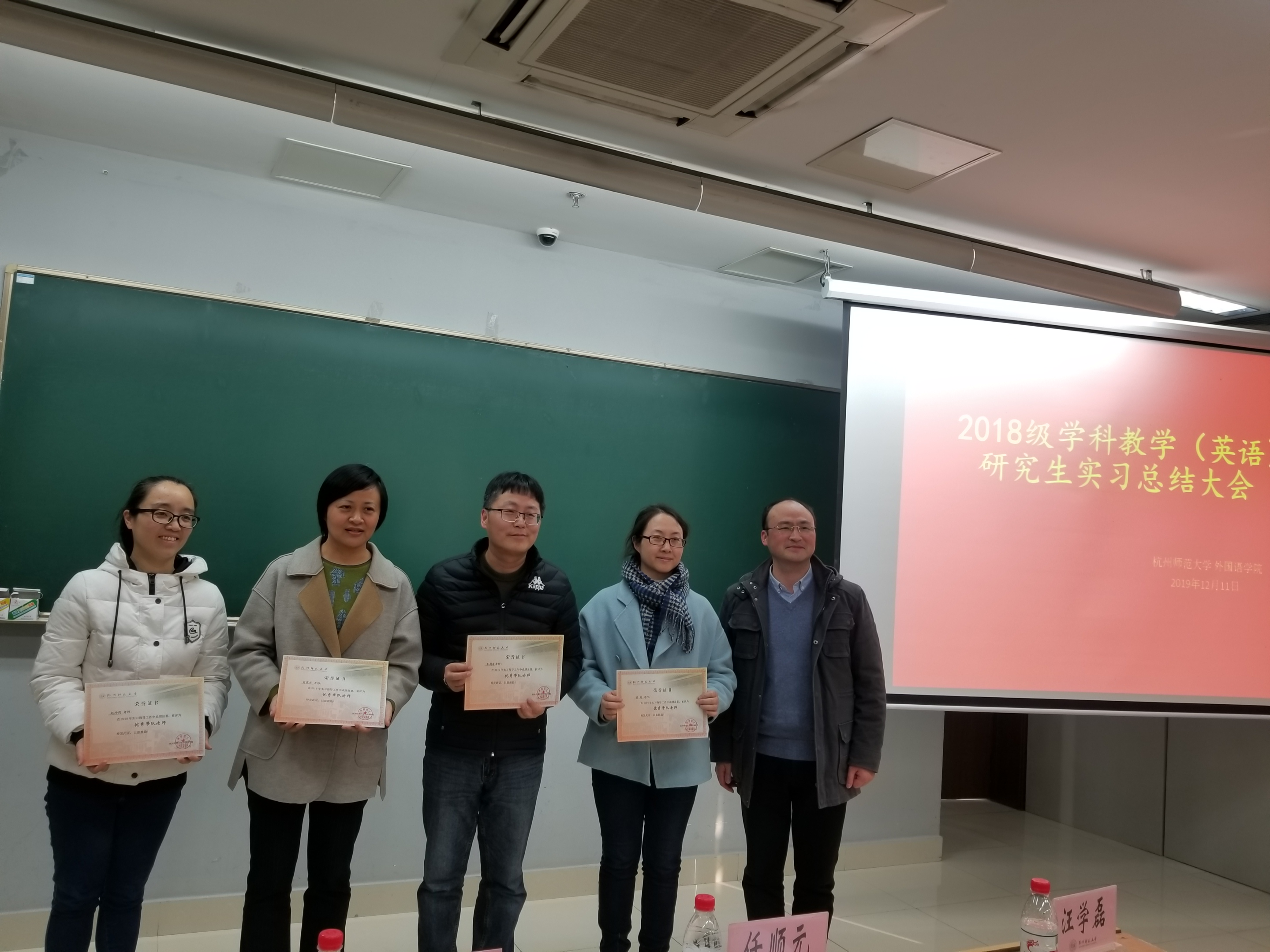 汇报结束后,进行了评奖活动,俞霞君、朱越峰、董琼、赵玲莉被评选为优秀带队老师。江南实验学校实习小组为一等奖,杭州文海中学实习小组、杭州翠苑中学获得二等奖,杭州学军中学实习小组、杭州仓前中学实习小组获得三等奖。吴圆圆、余晓鸣、郑羽亮、张凯文、史丽行、韩莹莹、陈丽敏和刘文言同学为优秀实习生。