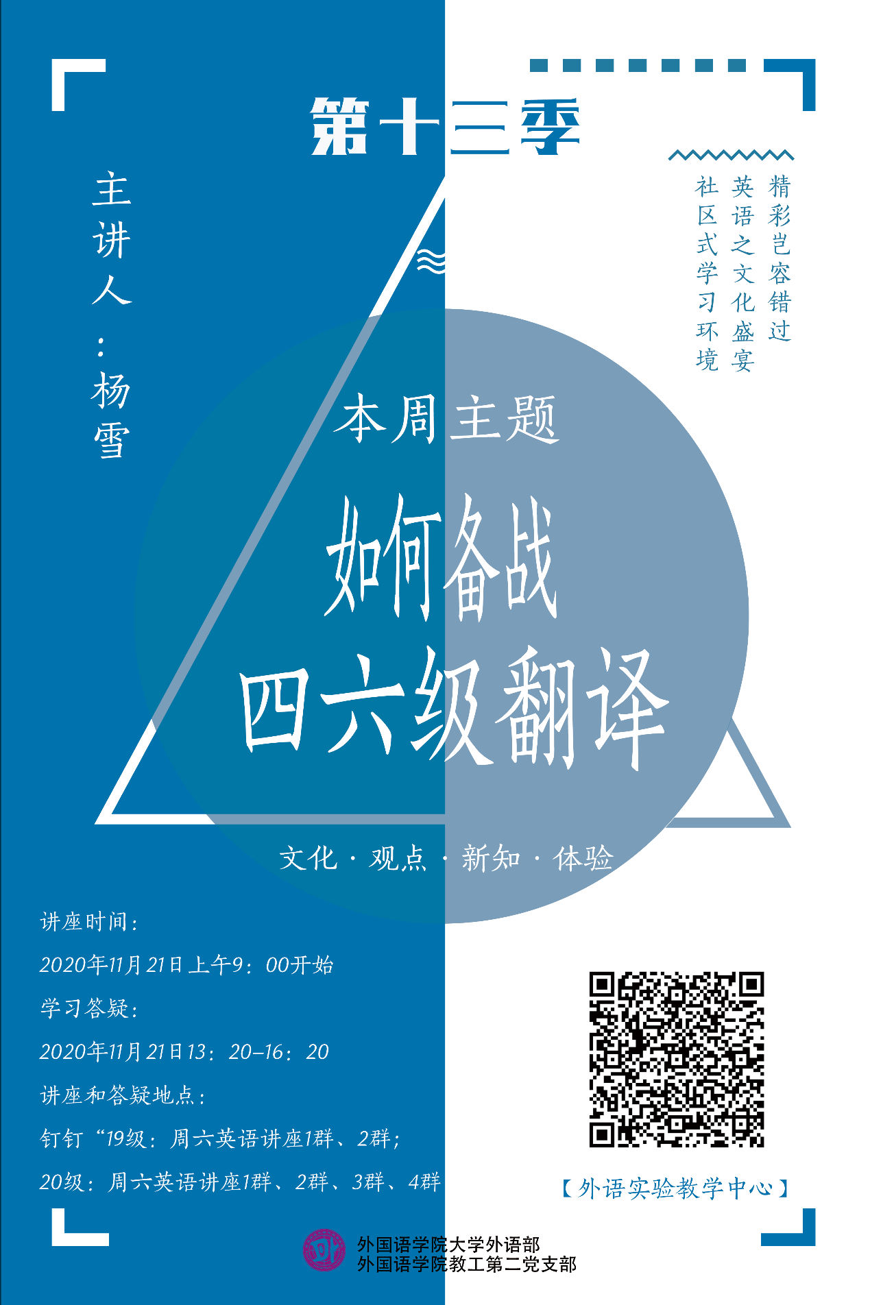 为更好地服务广大学生、满足其对英语学习的多样化和个性化需求,结合大学英语教学改革的实际,为在校学生营造良好的社区式英语学习氛围,从而提升学生的英语综合能力,大学外语部和教工第二党支部为全校学生开设的周末英语专题讲座活动目前已经进入了第十三季第五期。
