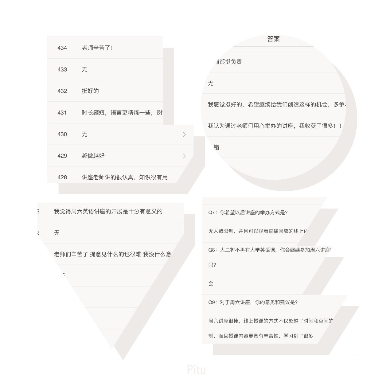 至此,大外部的第十三季周末英语学习讲座圆满落下了帷幕。讲座结束发放了1000份问卷,截止到周二下午6点,共回收596份问卷,调查结果显示,全校有理学院、医学院、外语学院、体育健康学院等17个学院的学生参与了周末英语讲座的学习,有74.66%的同学全程参与了7次以上的讲座。同学们对周六讲座纷纷表达了自己的喜爱之情:周六英语学习讲座干货满满,get到了很多考试技能、学会了英文写作、阅读等很多学习方法、增加了跨文化意识、拓宽了国际视野、明白了如何正确规划大学生活等。总之,同学们对这学期的周六英语学习讲座非常满意,即使大二将不再有大学英语课,90.93%的同学依然表示会继续参加周六讲座学习,认为周六的线上英语学习讲座不仅超越了时间和空间的限制,而且内容更具丰富性,学习到了很多,总之,周六讲座的举办很用心,开展十分有意义。