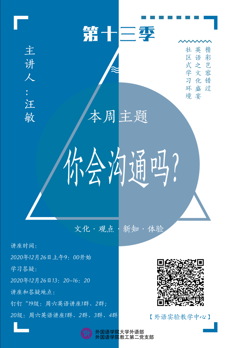 为更好地服务广大学生、满足其对英语学习的多样化和个性化需求,结合大学英语教学改革的实际,为在校学生营造良好的社区式英语学习氛围,从而提升学生的英语综合能力,大学外语部和教工第二党支部为全校学生开设的周末英语专题讲座活动目前已经进入了第十三季第九期。