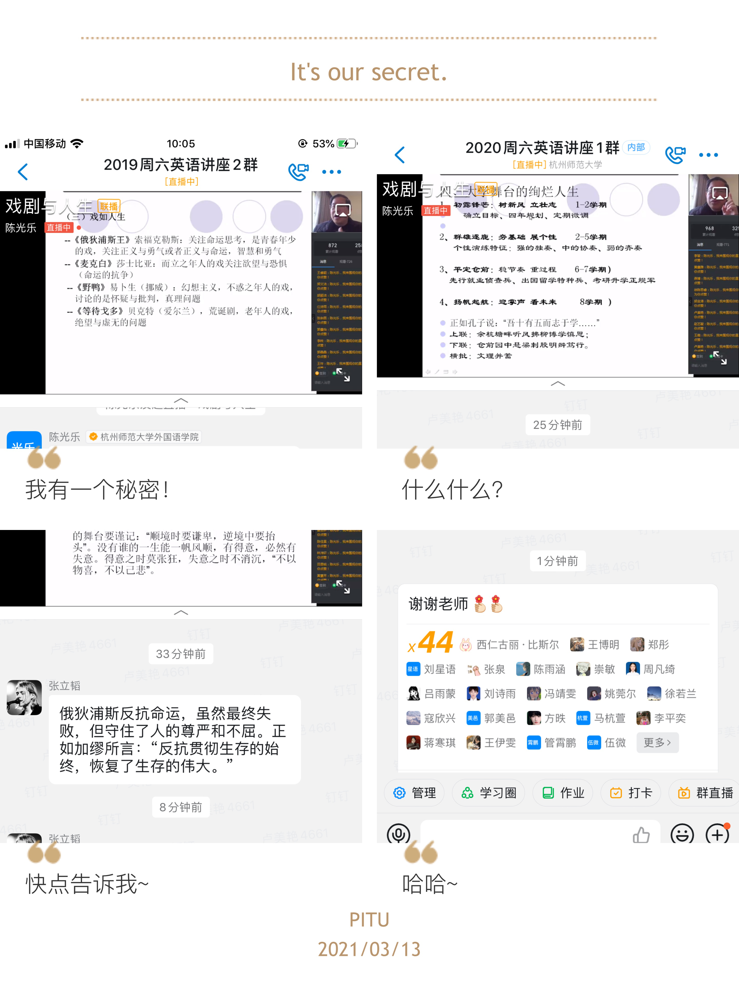 2021年3月13日,大学外语部的陈光乐老师以“戏剧与人生”为主题,正式拉开第十四季“周末英语学习讲座”大幕。大学生应该要对自己的未来有充分的想象,认知和规划,讲座开始陈老师先援引英国教育家怀特海(Alfred North Whitehead)在《教育的目的》书中的一段话,“学生是有血有肉的人,教育的目的是为了激发和引导他们的自我发展之路。……学生想象力的培养是我们大学存在的极其重要的理由,”分享了他对人生、对教育的见解。讲座通过对戏剧元素的特征与人生不同阶段的特点进行对比分析,从而引出对大学生的生涯规划的一些心得体悟和指导建议。陈老师鼓励学生在大学四年里学会集编、导、演一身来饰演一部属于自己的精彩人生大戏。直播过程中,学生随时可以通过“弹幕”的形式对老师提出的问题做出回答,并提出自己的问题,从而营造了线下课堂亲密互动的氛围。这样打破时间和空间限制的互动型讲座改变了以往讲座的单一模式,吸引了众多学生的参与。本次讲座截止到3月15日晚上12点,实际参与人数为3402位,主要为2020级和2019级的非英语专业学生。同时,也吸引了部分英语专业的学生;观看人次达到3400次,点赞数为7000。精彩的讲座和超高的人气为第十四季的周末英语讲座开了个好头!