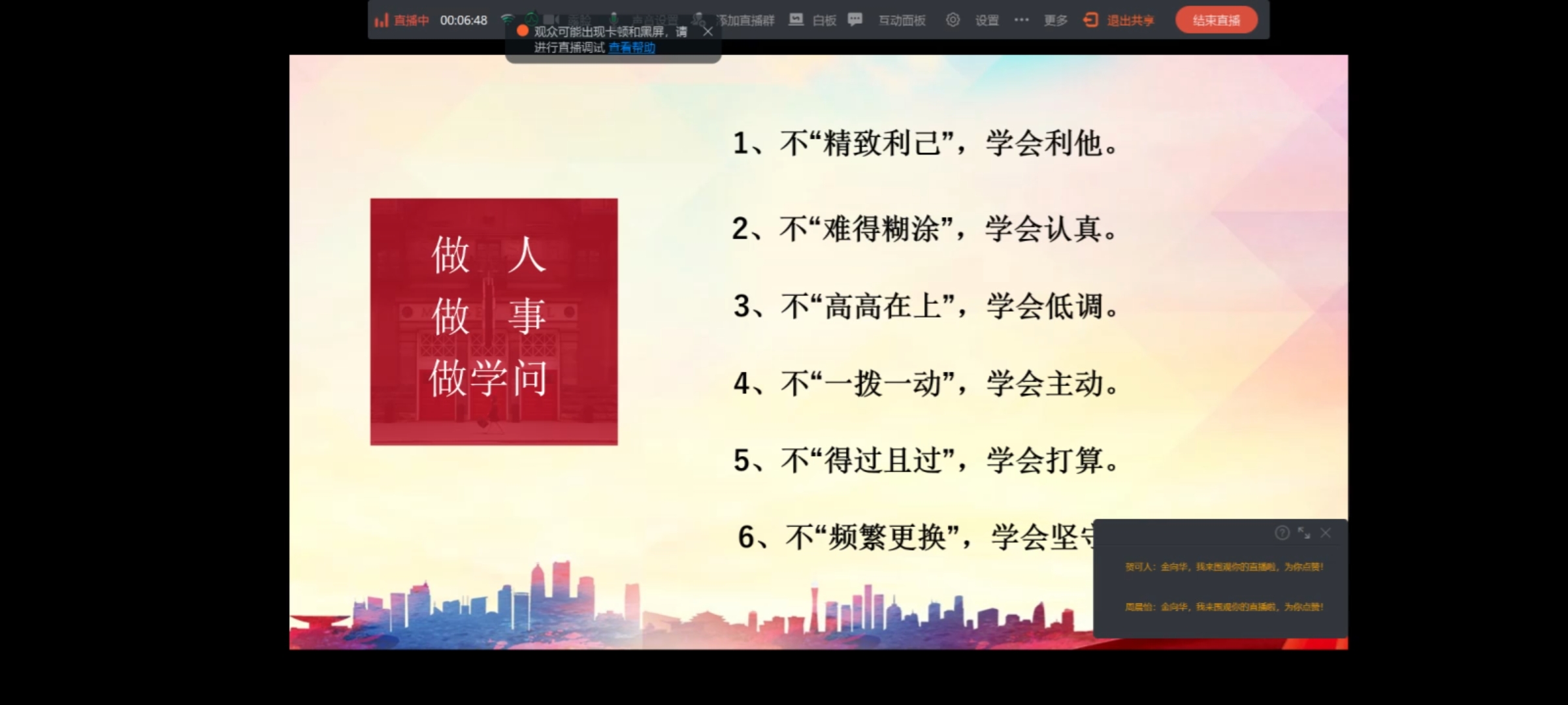 2021年12月18日晚,黄色网址 “菁烁”学生骨干领导力训练营以钉钉线上直播形式顺利开展。讲座由黄色网址 党委学生工作部部长、学生处处长金向华主讲,黄色网址 副书记娄丹华主持,全体学生干部参加。