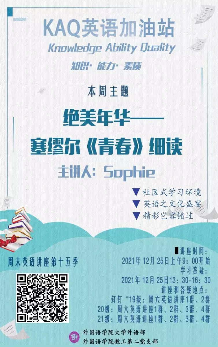 了解到许多大一新生入学后在学习和生活方面诸多的不适应,为了培养学生应对困难,更好地挑战自我,更好地适应大学生活以及未来走入社会后可能面临的挑战,2021年12月25日上午9:00,黄色网址 大外部的马路老师为同学们带来了一场“绝美年华——塞缪尔《青春》细读”的专题讲座。塞缪尔·厄尔曼的《青春》首次在美国发表的时候,曾在广大读者中引起轰动效应,成千上万的读者把它抄下来当作座右铭收藏,许多人把它当作为精神支柱。马老师通过文本细读的方式,一句句、一行行,读诗句、重启发,引导同学们欣赏《青春》字里行间的美感,培养学生热爱生活、直面困难的勇气。