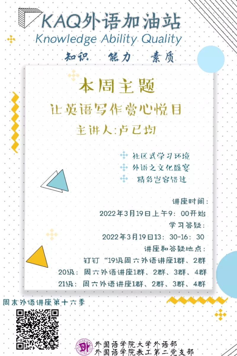 为了满足师大学生在外语能力上“一精多会”和“一专多能”的需求,“周六外语公益讲座——‘KAQ(知识、能力、素质)外语加油站’”,秉持一贯的SIM(student-centered, Innovative,Multilingual)“以生为本、不断创新、多语种国际视野”三个着力,在2022年3月19日,特意邀请大学外语部的四六级作文资深阅卷老师——卢已均,在仓前校区和下沙校区通过10个钉钉群线上直播,给同学们带来了一场题为“让英语写作赏心悦目”的讲座。