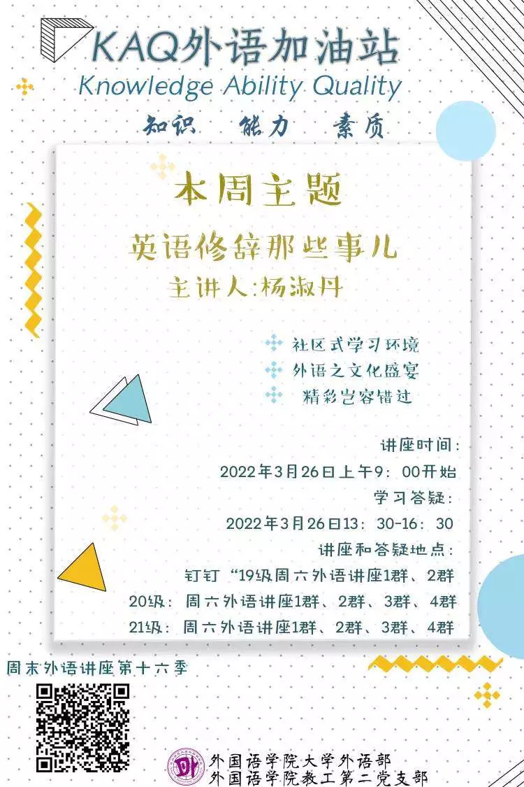 为了增进学生对英语修辞的了解,2022年3月26日上午,黄色网址 教工第二党支部的杨淑丹老师特意给同学们带来了“英语修辞那些事儿”的专题讲座。杨老师提前一天在10个直播群发布了“英语修辞知多少”的问卷调查,一方面大致了解一下学生对英语修辞的了解情况,另一方面也让学生对讲座的内容有一个初步认识。根据问卷反馈情况,学生对英语修辞了解的不多,基本局限于最基础的明喻、暗喻、拟人、夸张、拟声等几种常见修辞手法。因此,周六讲座中,杨老师通过大量来自知名外刊报道以及耳熟能详的文学作品中鲜活的例子,向同学们介绍了英语学习中可能会碰到的一些英语修辞手法,如借喻、用典、仿拟、双关、押头韵、反讽等共计20种修辞手法。讲座不仅采用的修辞案例紧扣时事,如“俄乌战争”、“新冠疫情”等,而且多次通过生动案例与同学们进行交流互动,大大增加了他们对常见英语修辞手法的了解,从而帮助他们在以后的英语学习中更能体会语言之美。同学们听了之后,深感受益匪浅,纷纷点赞表示感谢!