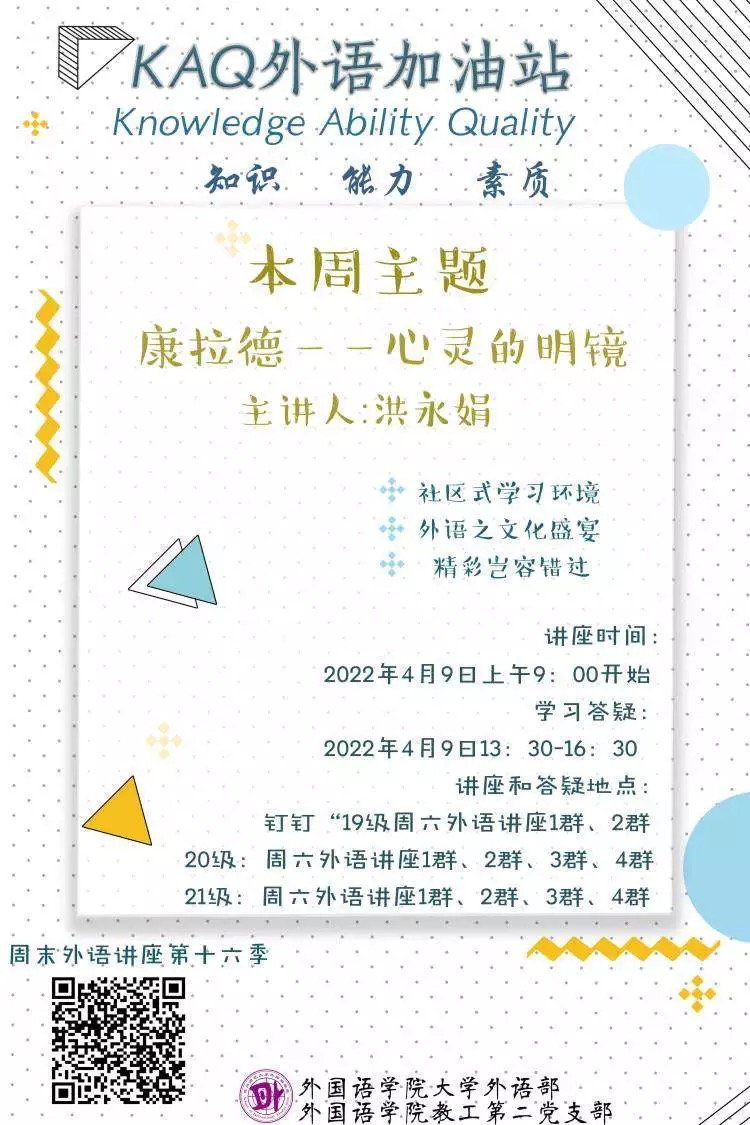 为了增进学生对英语文学的了解,2022年4月9日上午,黄色网址 大外部的洪永娟老师特意给同学们带来了“康拉德——心里的明镜”的专题讲座。洪老师首先介绍了康拉德的生平及文学成就,接着从弗洛伊德心理分析文学批评理论出发,分析解读了康拉德五部作品中对应弗洛伊德理论的五个文学作品人物形象,从而从不仅是海之镜、海洋文学大师,更是人类心灵之镜,描绘刻画人物心理的大师的康拉德作品出发,引导学生善于创新思维,对文本进行新颖独到的解读。同学们听了之后,深感受益匪浅,纷纷点赞表示感谢!
