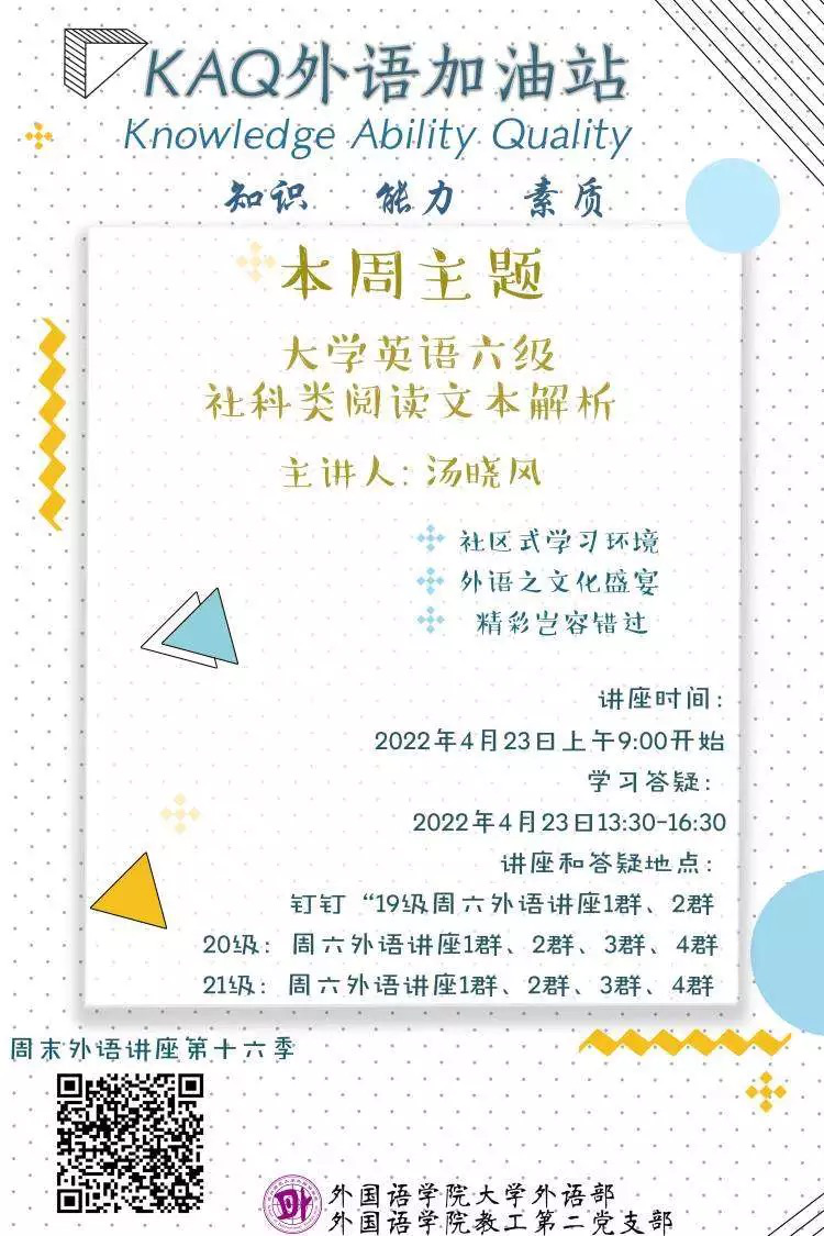 为了夯实学生的大学英语六级阅读水平,并提升思辨能力和人文素养,2022年4月23日上午9点,黄色网址 大外部的汤晓风老师特意给同学们带来了“大学英语六级社科类阅读文本解析”的专题讲座。讲座中汤老师以大学英语六级阅读材料为素材进行人文解析,旨在引导学生在英语文本阅读过程中不应限于培养英语阅读技能,还应培养开展深度学习的意识与能力,通过对英语文本的深入解读与剖析,汲取篇章内容背后传递的人文与文化,进一步开发思辨能力,提升人文素养与科学精神,为完善当代大学生所应具备的核心素养打好坚实基础。同学们听了之后,深感受益匪浅,纷纷点赞表示感谢!