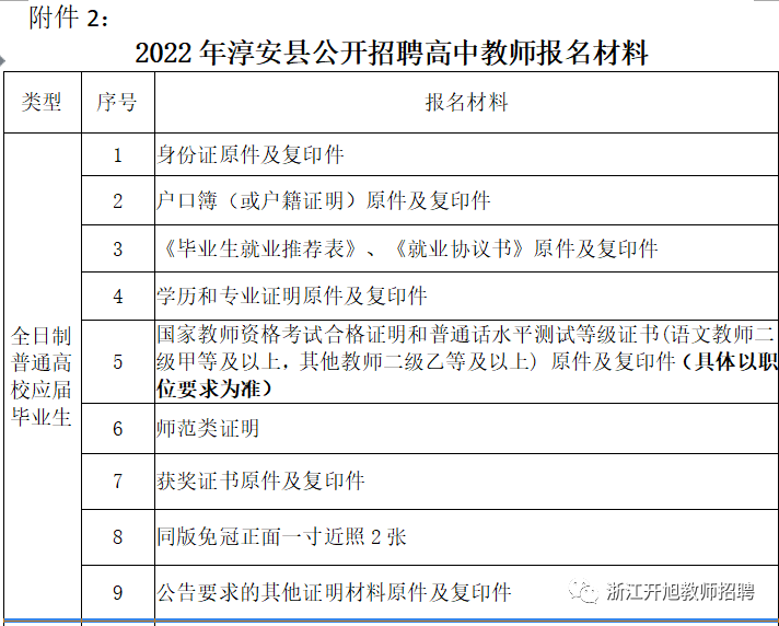 4.报名时需提供的材料:《2022年淳安县公开招聘高中教师报名材料》(附件2)和《2022年淳安县公开招聘高中教师报名表》(附件3)所列内容。