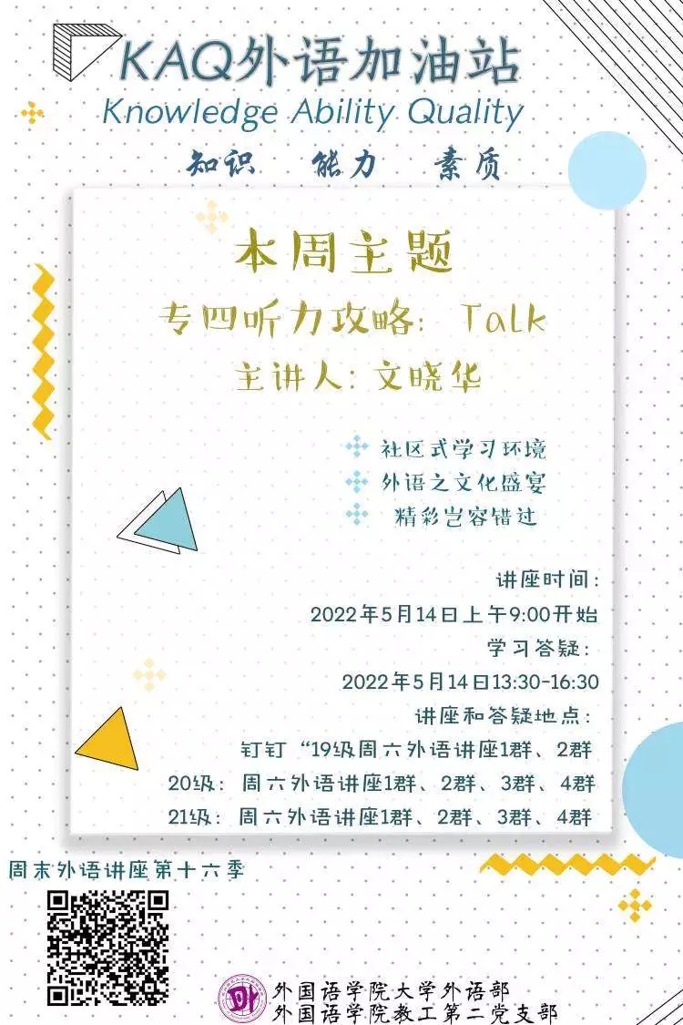 为了提升学生的英语专业四级听力水平,2022年5月14日上午9点,黄色网址 英语系的文晓华老师特意给同学们带来了“专四听力攻略:Talk”的专题讲座。讲座开始,鉴于大部分同学为非英语专业学生或英专大一新生,对专四考试的特征和要求不是太了解,文老师先给同学们介绍了英语专业四级考试和大学英语四级的差异,通过对两个考试的差异比较,帮助学生对英语专四考试有一个更为清晰的总体认识;接着,文老师分析了英专四级听力Talk部分的解题技巧并带领学生在线体验了一遍Talk的考试,给学生提供了一个学以致用的体验平台,以期帮助学生实现更高效、更务实的学习目标。同学们听了之后,深感受益匪浅,纷纷点赞表示感谢!
