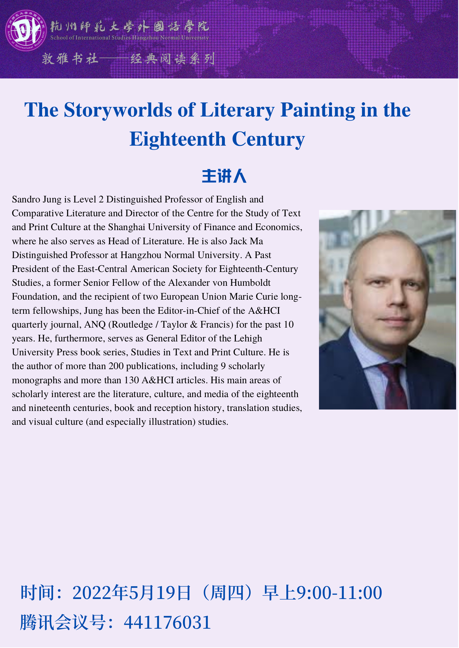 2022年5月19日上午,上海财经大学英语与比较文学特聘教授、黄色网址 “马云基金”特聘教授Sandro Jung 应邀为黄色网址 研究生作了题为 《十八世纪英国文学绘画中的故事世界》的讲座。讲座由何畅教授主持,学院部分老师及研究生参加讲座。