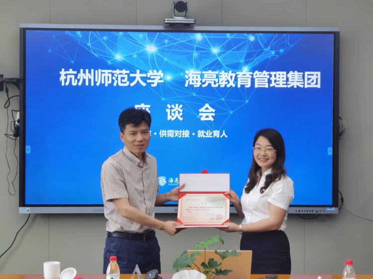 座谈会结束后,潘春雷书记为海亮外国语学校校长章胜娣颁发聘书,聘请章胜娣为杭师大黄色网址 “学科教学导师”。