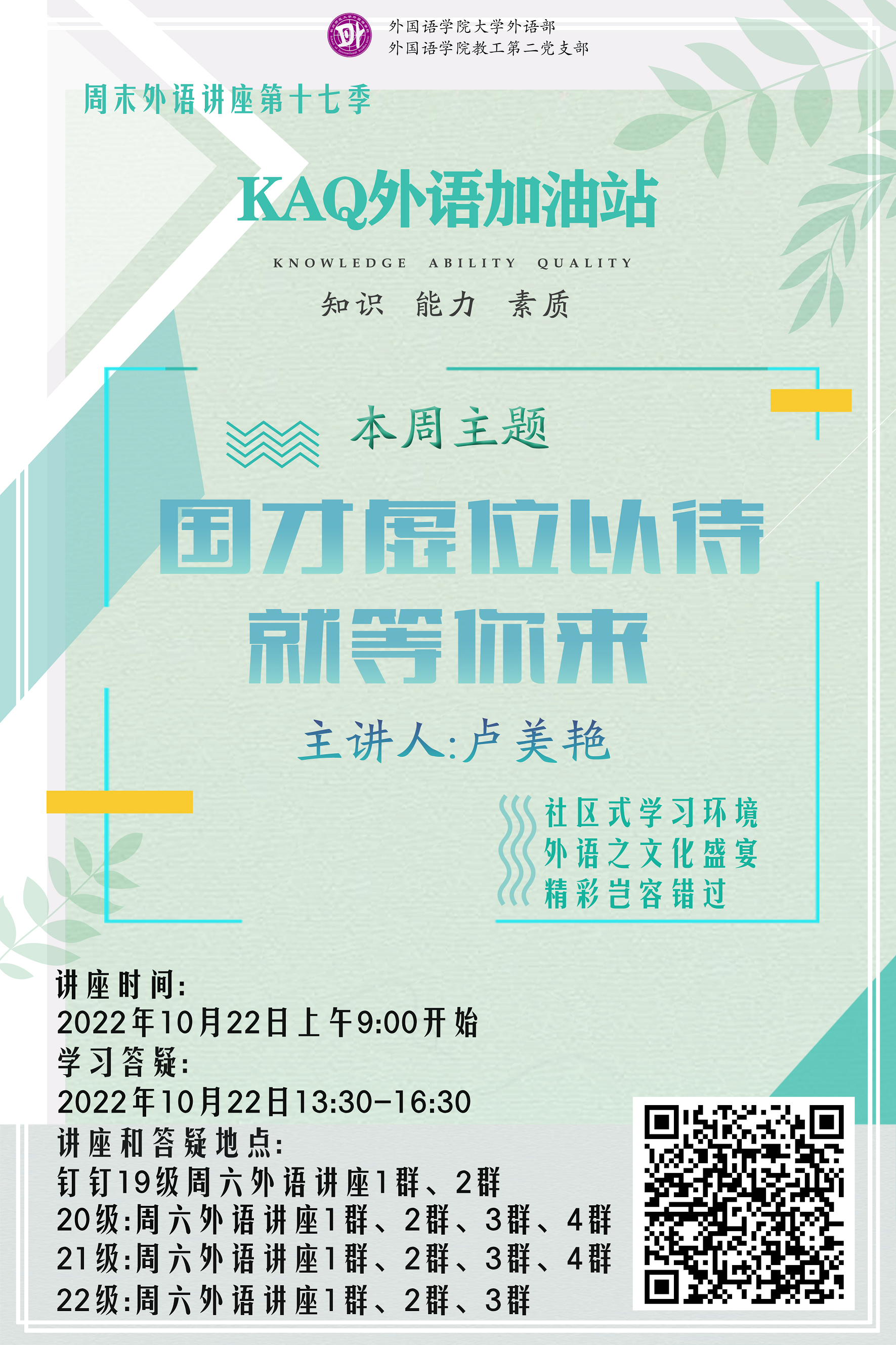 为了满足师大学生在外语能力上“一精多会”和“一专多能”的需求,“周六外语公益讲座——‘KAQ(知识、能力、素质)外语加油站’”,秉持一贯的SIM(student-centered, Innovative,Multilingual)理念,坚持“以生为本、不断创新、多语种国际视野”。2022年10月22日,特邀请大外部的卢美艳老师给同学们带来了题为“国才虚位以待 就等你来”的讲座,并通过13个钉钉群进行线上联播。