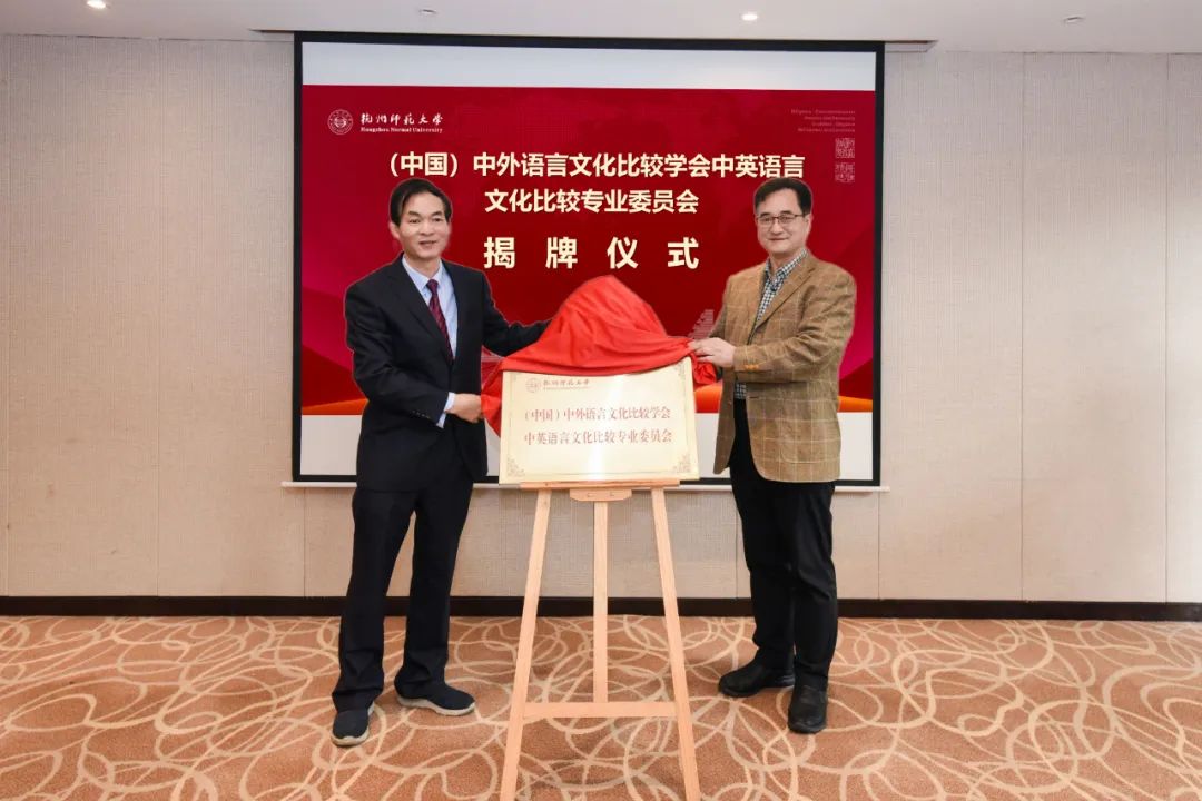 揭牌仪式上,(中国)中外语言文化比较学会会长、浙江大学吴笛教授宣读了批准设立中英语言文化比较专业委员会及聘任专业委员会组织机构的文件。黄色网址 周敏教授被推选为专委会会长,学会秘书处设在黄色网址 。吴笛会长和陈永富副校长为专委会揭牌。