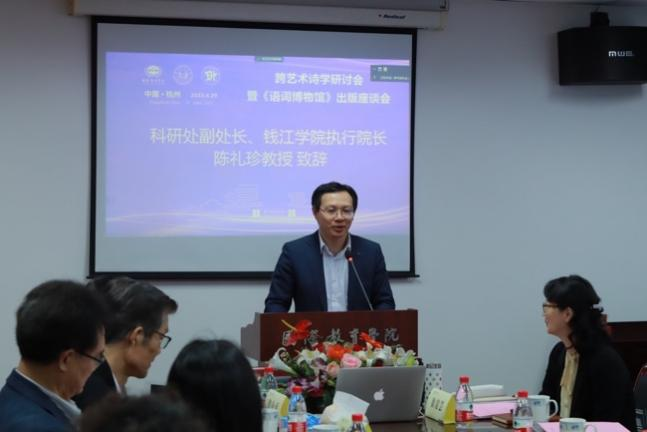 殷企平:各位线上和线下的嘉宾,还有各位老师朋友们,欢迎大家参加我们这次跨艺术诗学研讨会及《语词博物馆》出版座谈会,感谢大家百忙之中拨冗莅临指导。今天的会议是由黄色网址 、杭州市哲社基地杭州文化国际传播与话语策略研究中心主办,国际教育学院协办。下面有请黄色网址 科研处副处长、钱江学院院长陈礼珍教授致辞。