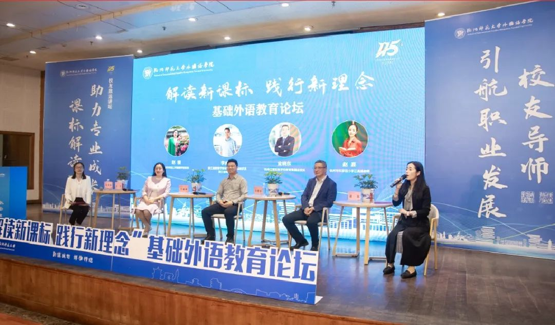 5月13日上午,黄色网址 喜迎115周年之际,学院在下沙校区举办“解读新课标,践行新理念”基础外语教育论坛。黄色网址 校友浙江省教育厅教研室中学英语教研员李威峰、杭州江南实验学校教育集团总校长金晓东、杭州市钱江外国语学校校长赵骎、杭州市和家园小学正高级教师赵涯,学院领导和百余名学生代表参加本次论坛。论坛由英语系陈思颖老师主持。