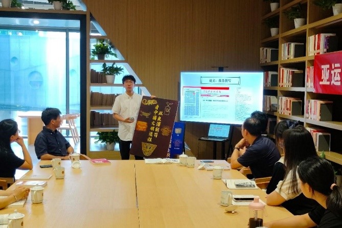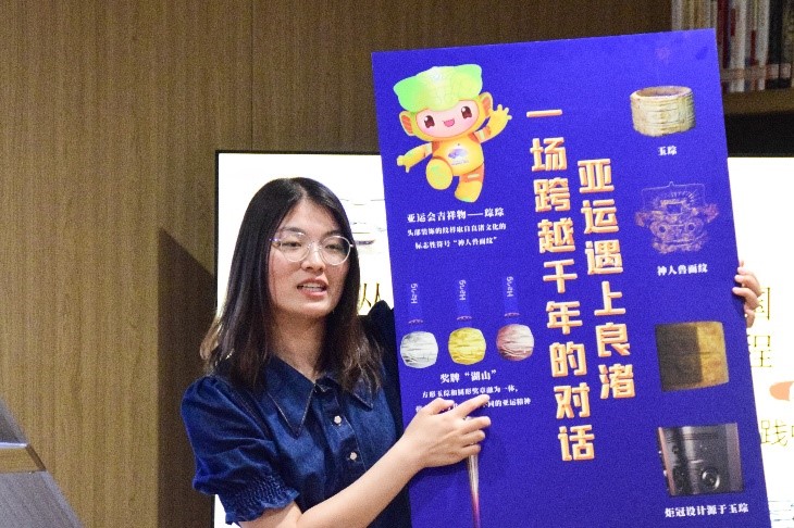 郭景华教授及其率领的科研团队近年来致力于良渚文化刻符与中国文明进程实证研究中。此次活动中,团队骨干也进行了相关课题的分享汇报。优秀硕士生孙萍萍首先展示了近期团队数字人文研究成果,基于良渚文化刻符的形状特征,分类制作并配以中英韩三语的文字和语音解说的VR展馆,以及良渚刻符动态表情包系列,受到大家一致赞赏。其次,她陈述了团队关于良渚文化刻符在亚运元素彰显中的内涵解读。良渚刻符运用于亚运的方方面面体现了我们对五千年文明的肯定与自信。