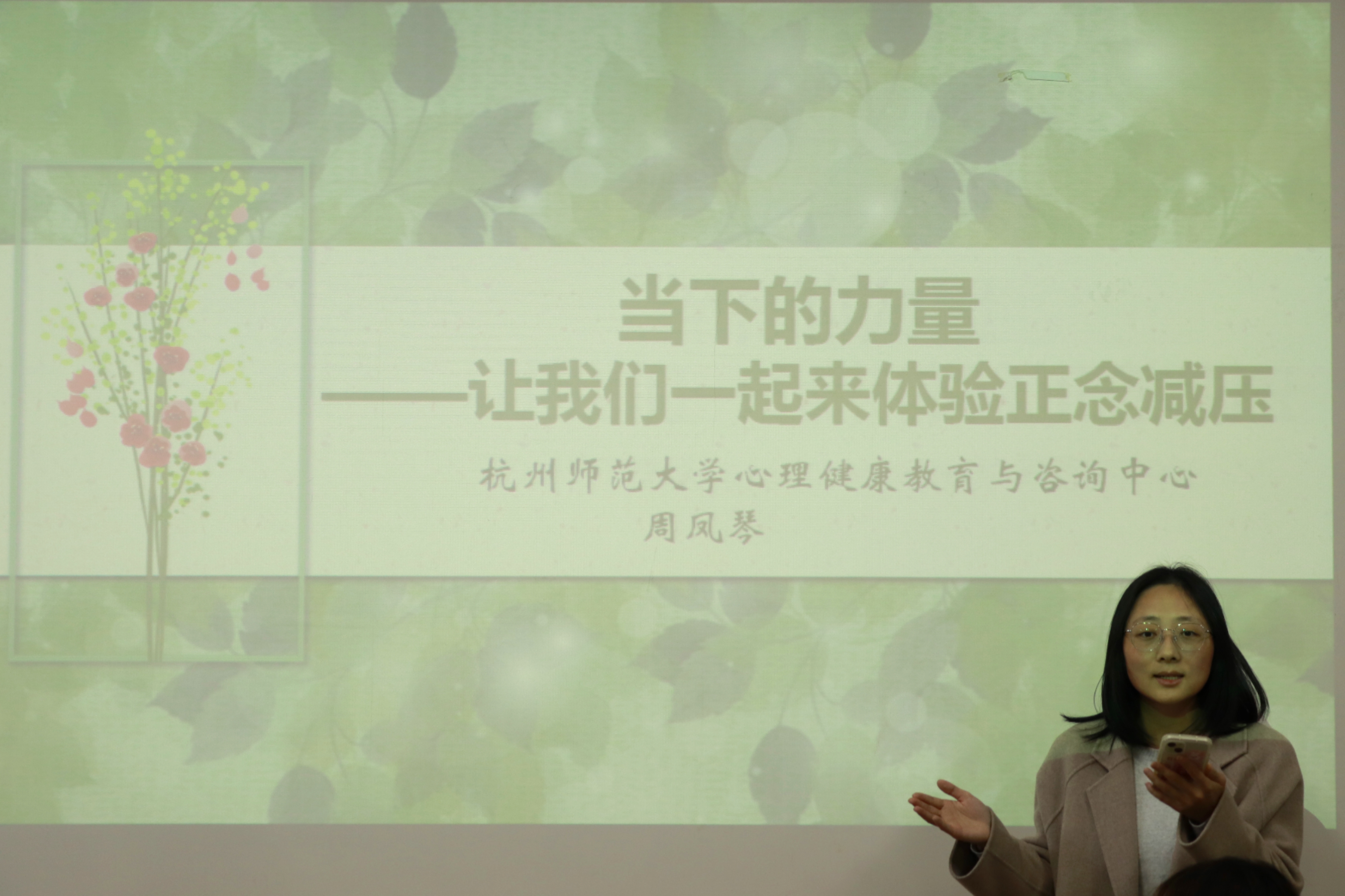 12月9日下午,由专职心理咨询师周凤琴老师主讲的讲座“当下的力量——让我们大家一起体验正念减压”在下沙校区C号楼104西顺利举行,此次心理团辅活动为黄色网址 “我为学生办实事”系列活动之一。黄色网址 25名学生代表参与本次讲座,辅导员张培艺老师主持。