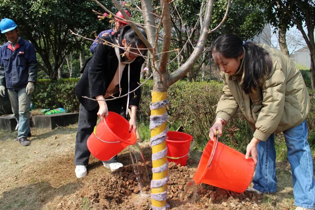 活动中,老师与同学们共同协作,并肩而立一一把稳树干、覆土施肥、筑基围坝、剪枝浇水,清新的泥土上洒满了粉色的樱花瓣。在这片宁静的校园角落,师生们心手相连,共同打造和谐美丽的生态校园。