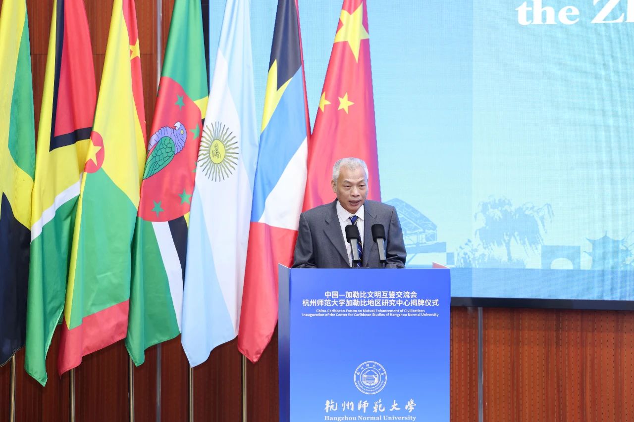 陈先春在致辞中指出,加勒比地区拥有着独特的历史文化自然景观和经济发展模式,希望中心持续拓展研究领域,不仅关注传统历史文化,还要更加深入探讨科技创新、可持续发展、海洋资源利用等方面的内容,通过举办各类国际学术研讨会,不断提升学术影响力;持续加强与企业界的合作,助推加勒比地区实现经济的转型升级;积极开展文化交流活动,增进中国和加勒比地区人民的理解和交往。他表示,省社科联也将一如既往支持杭师大的建设发展。