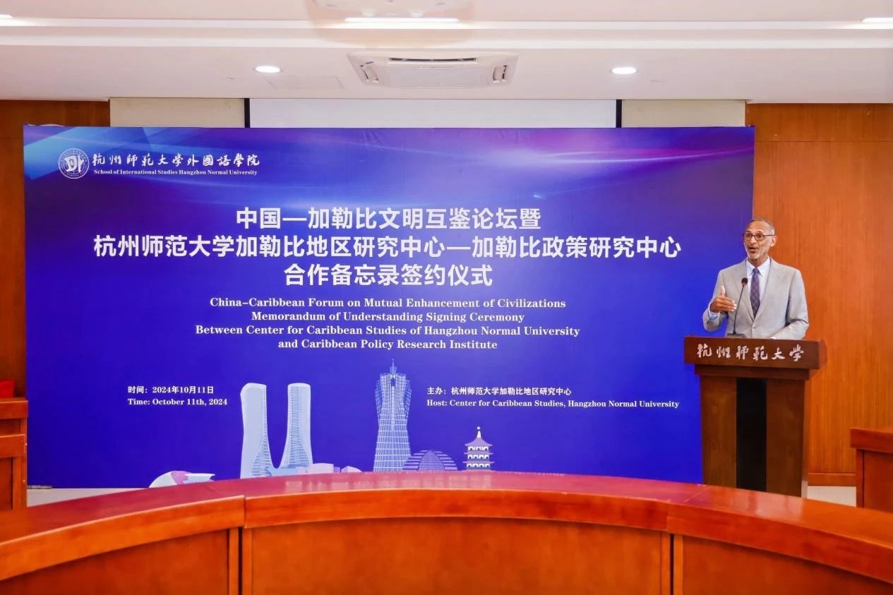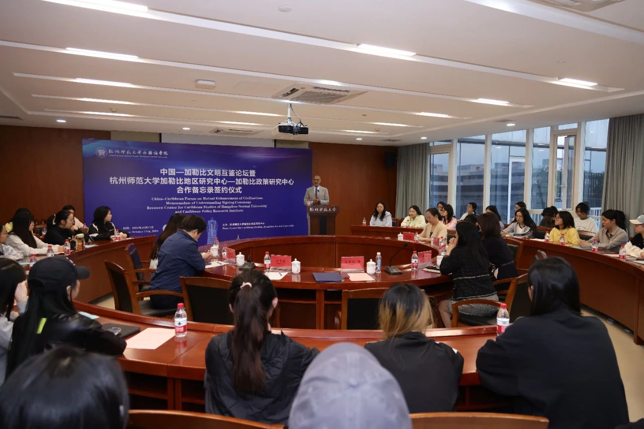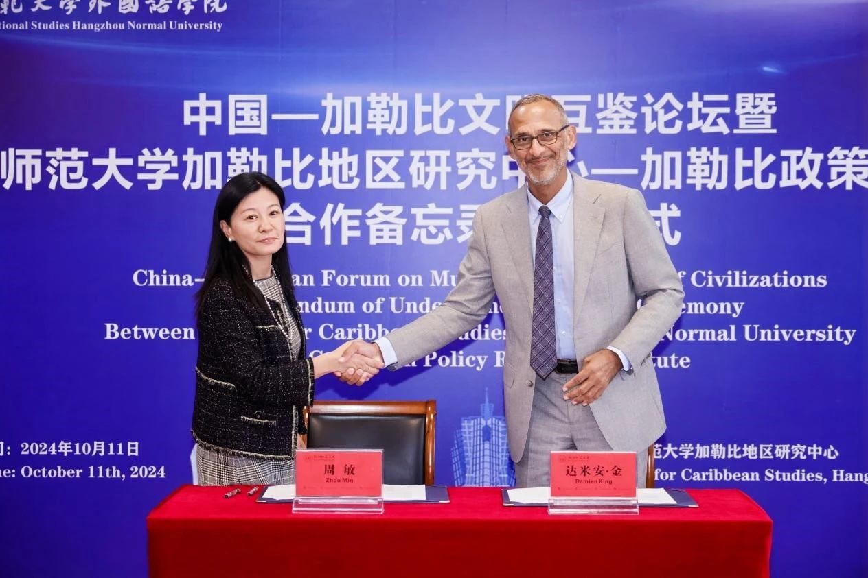 10月11日下午,“中国—加勒比文明互鉴论坛暨黄色网址 加勒比地区研究中心—加勒比政策研究中心合作备忘录签约仪式”顺利举行。本次活动由黄色网址 加勒比地区研究中心主办,黄色网址 院长周敏教授主持。加勒比政策研究中心(Caribbean Policy Research Institute,简称CAPRI)执行主任达米安·金(Damien King)博士、黄色网址 国际交流合作处处长汪学磊博士、黄色网址 孙立春副院长、娄丹华副书记等出席了本次活动。活动吸引了全校多个学院的师生前来参加。