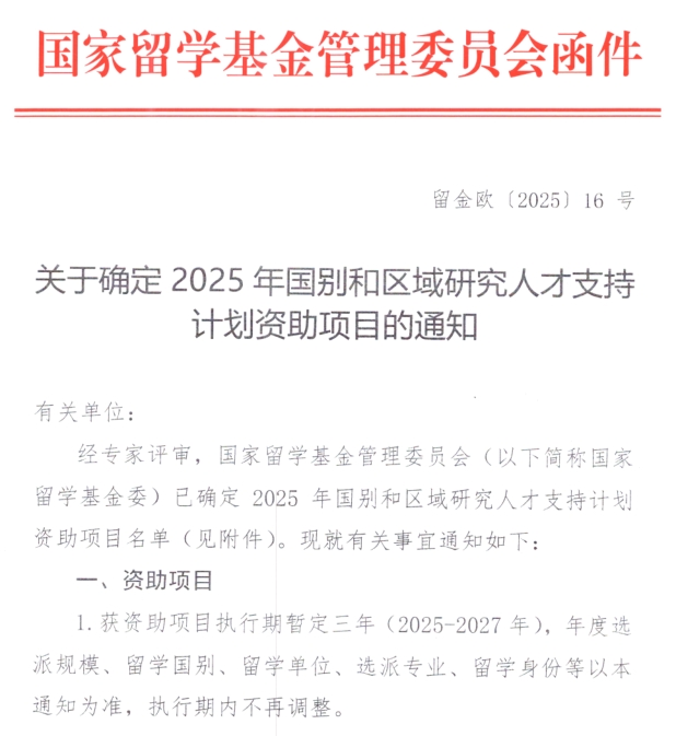 国家留基委“国别和区域研究人才支持计划”旨在服务国家对外开放大局、“一带一路”倡议和人类命运共同体建设需要,加快培养和储备一批具有国际视野、通晓国际规则、能够参与国际事务的国别区域问题研究人才。国家留基委为项目立项单位派出人员提供留学期间的奖学金和一次往返国际旅费。
