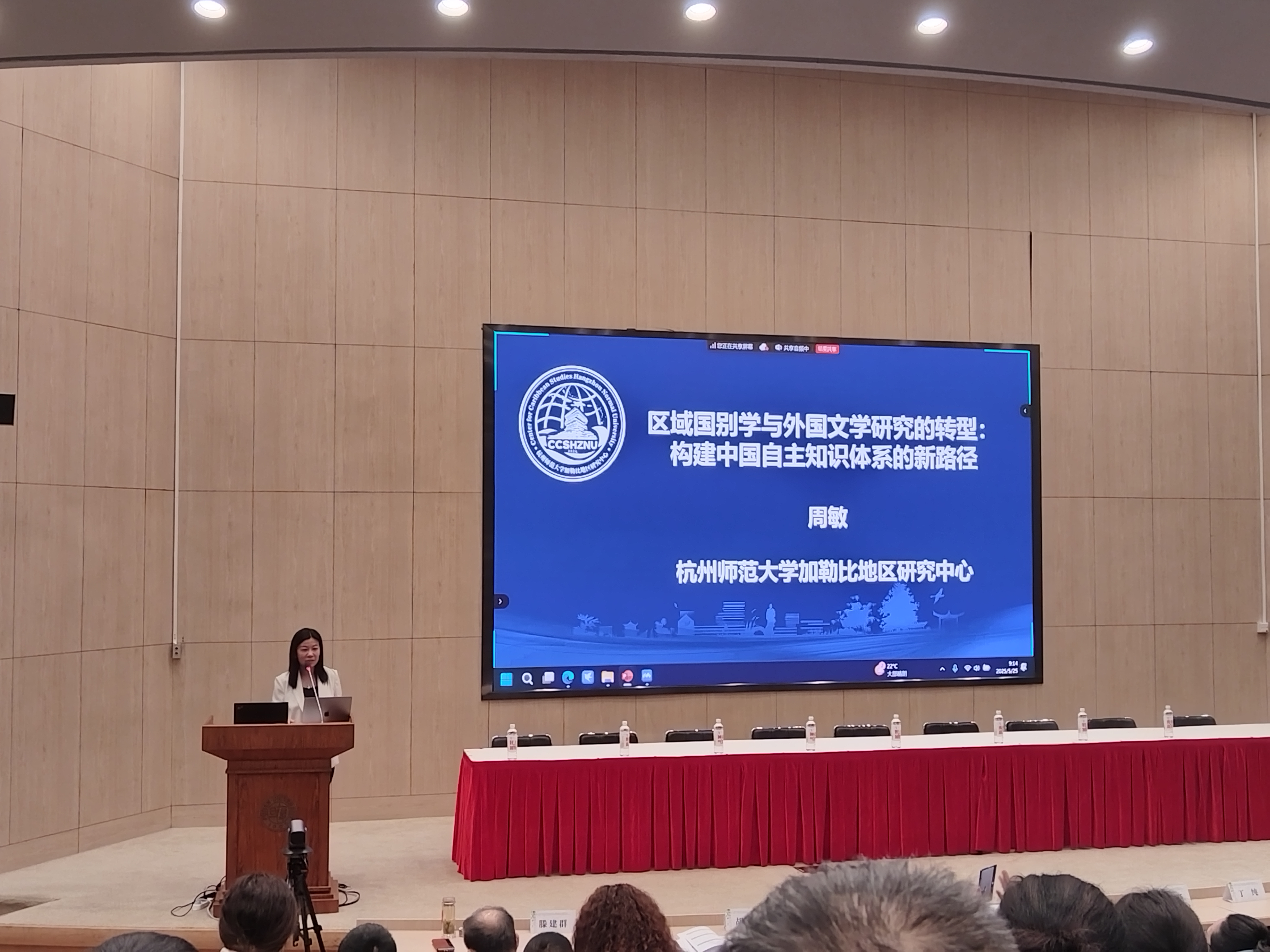 在本次会议上,周敏院长发表了题为“区域国别学视阈下的外国文学自主知识体系构建”的主旨发言。她认为在外语学科面临巨大挑战的今天,学科转型势在必行,而区域国别研究将成为外语学科发展的“新赛道”。她强调,区域国别研究应立足于语言、区域与专业融合,服务知识体系建设与国际视野人才培养的双重目标。随后,周院长以黄色网址 加勒比地区研究中心为例,介绍了该中心的建设情况,并分享了黄色网址 加勒比研究团队的实践探索心得。周院长的发言引发了现场众多学者的共鸣,得到与会专家们的一致认可。