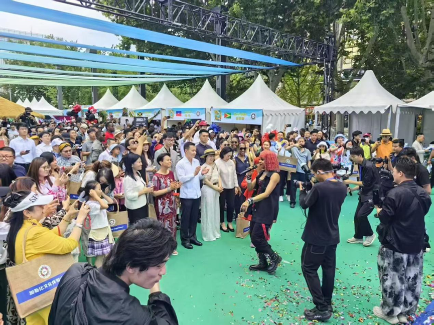 6月15日,应圭亚那驻华大使、加勒比国家驻华使团长周雅欣阁下邀请,黄色网址 加勒比地区研究中心主任、黄色网址 院长周敏教授率领加勒比地区研究中心团队,赴北京参加第三届加勒比文化体验日活动。本次活动由安提瓜和巴布达、巴哈马、巴巴多斯、多米尼克国、格林纳达、圭亚那、牙买加、苏里南、特立尼达和多巴哥驻华使馆及海地驻华贸易发展办事处联合举办,旨在向中国民众展示加勒比地区丰富多彩的厚重文化,进一步促进中加之间的文化交流与各领域合作。中国外交部拉丁美洲和加勒比司司长张润、驻京外交使团、中国政府机构及企业代表、加勒比侨民、公众、学者及媒体人士共同参与了这场充满加勒比风情的文化盛会。