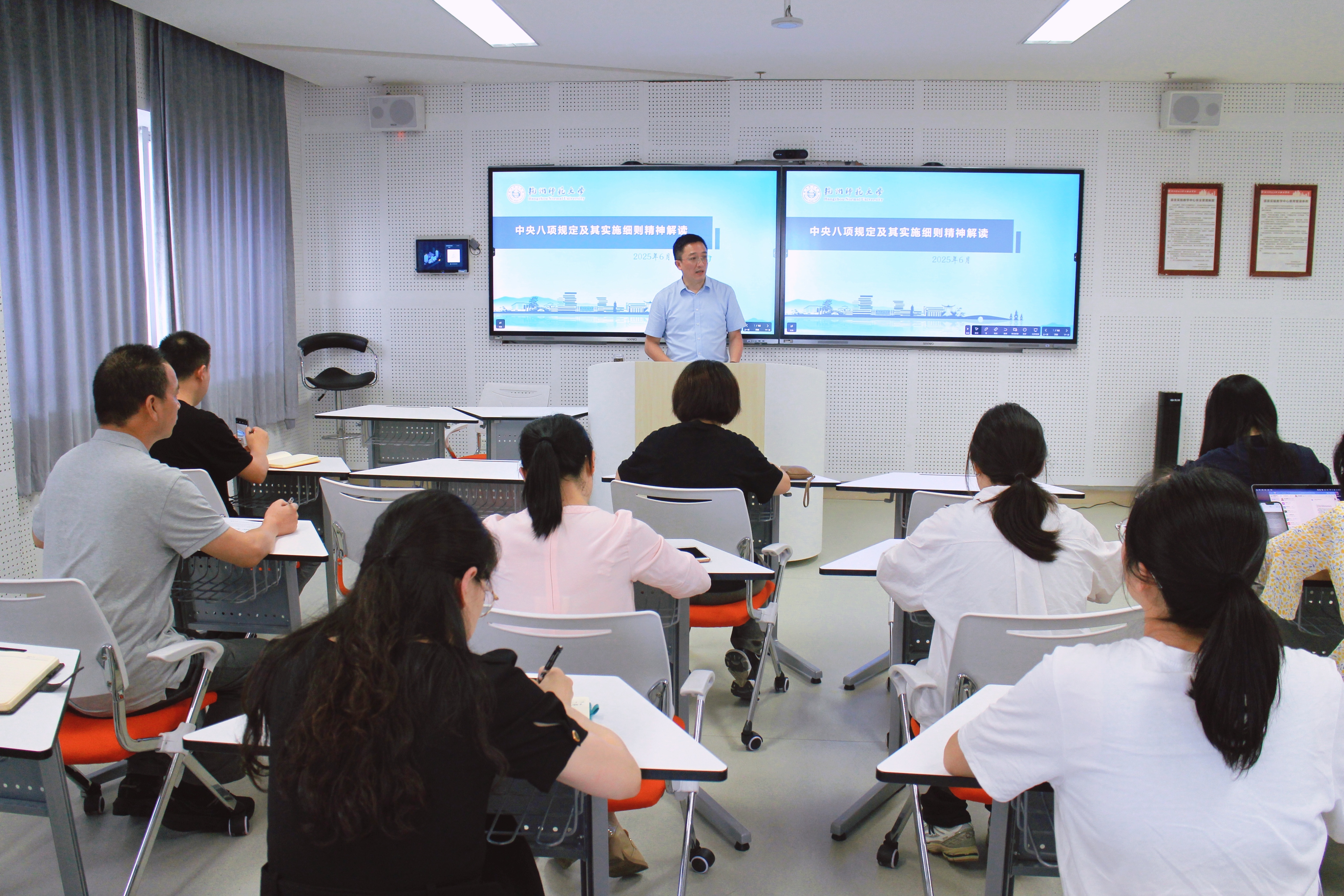 6月26日下午,黄色网址 组织开展教职工政治理论学习,党委书记袁智杰以《中央八项规定及其实施细则精神解读》为题讲授专题党课,全体行政人员参加学习。