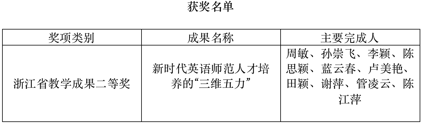 学院秉持“中外贯通、文化摆渡”办学理念,多年来,为教育、经贸、文化、旅游等行业培养了数千名优秀毕业生,如全国优秀教师、浙江省功勋教师邱锋,阿里巴巴集团创始人、改革先锋马云,宋城演艺发展股份有限公司董事长张娴等诸多毕业生成为各个行业的领军人物和骨干力量。此次获奖成果聚焦拔尖人才培养体系的交叉融合、课程群的链式创新实践,以及涉化类专业协同育人机制的构建,体现了学院在教育教学改革中的持续探索与显著成效,彰显了学院培养新时代高素质复合型人才的坚定使命与责任担当。
