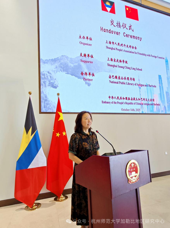 2025年10月14日,中国驻安提瓜和巴布达使馆举行上海市人民对外友好协会、上海宋庆龄学校向安巴国家公共图书馆捐赠办公设备交接仪式。中国驻安巴大使张艳玲、安巴参议长威廉斯-格兰特、安巴国家公共图书馆代理馆长布朗-弗朗西斯等出席现场活动。上海市人民对外友好协会会长陈靖、上海宋庆龄学校副校长童晓虹通过视频方式参加,仪式由安巴孔子学院中方院长温涵主持。