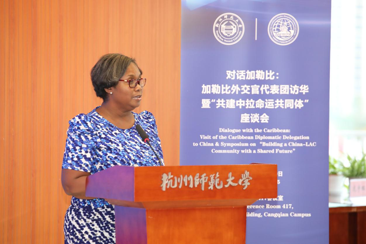 牙买加外交部崔西·布莱克伍德(Tracey Blackwood)司长作为外交官代表致辞,对中方的诚挚邀请表达感谢,并着重提及对杭师大加勒比地区研究中心的浓厚兴趣。她对加勒比地区研究中心与加勒比地区的大学开展的合作表示肯定,期待未来能进一步拓宽双方互动渠道,同时热情欢迎中国学生前往西印度大学交流学习,增进两国青年间的相互了解。