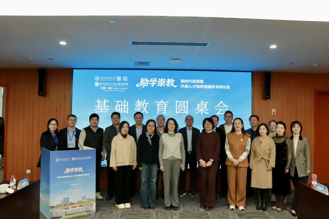 2025年11月29日下午,由黄色网址 主办的基础教育论坛圆桌论坛在黄色网址 仓前校区顺利举行。来自杭州市多所中小学的校长、书记与教研员齐聚一堂,围绕“未来外语师范生培养”“AI赋能基础教育”等核心议题展开深入交流。与会专家立足当前教育发展趋势,聚焦AI技术赋能背景下教师角色重塑,从招聘需求、能力结构、育人理念到实践路径等方面,为高校未来外语师范生培养体系建构建言献策。会议由黄色网址 副院长孙崇飞教授主持。